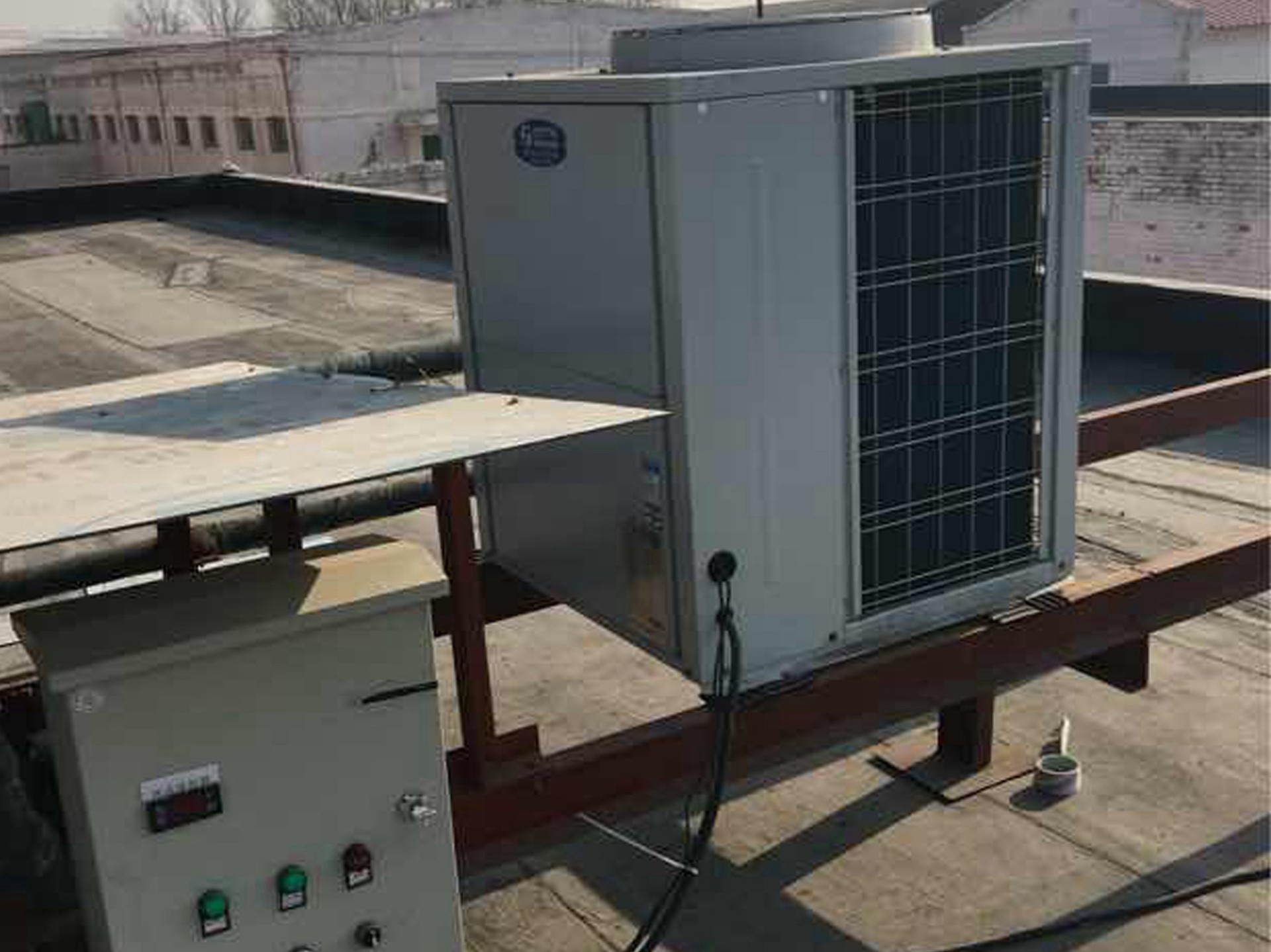 本項(xiàng)目為北京言午門(mén)窗有限公司空氣源熱泵采暖系統(tǒng)工程。本工程共分五個(gè)系統(tǒng)。各系統(tǒng)獨(dú)立運(yùn)行,相互不受影響。空氣源熱泵設(shè)備主機(jī)及循環(huán)水泵根據(jù)現(xiàn)場(chǎng)實(shí)際情況放置在各區(qū)域的樓頂。要求每幢樓的采暖溫度不能低于18℃。采用天舒低環(huán)境溫度空氣源采暖熱泵,在滿足使用需求的前提下,大大降低了運(yùn)行費(fèi)用。