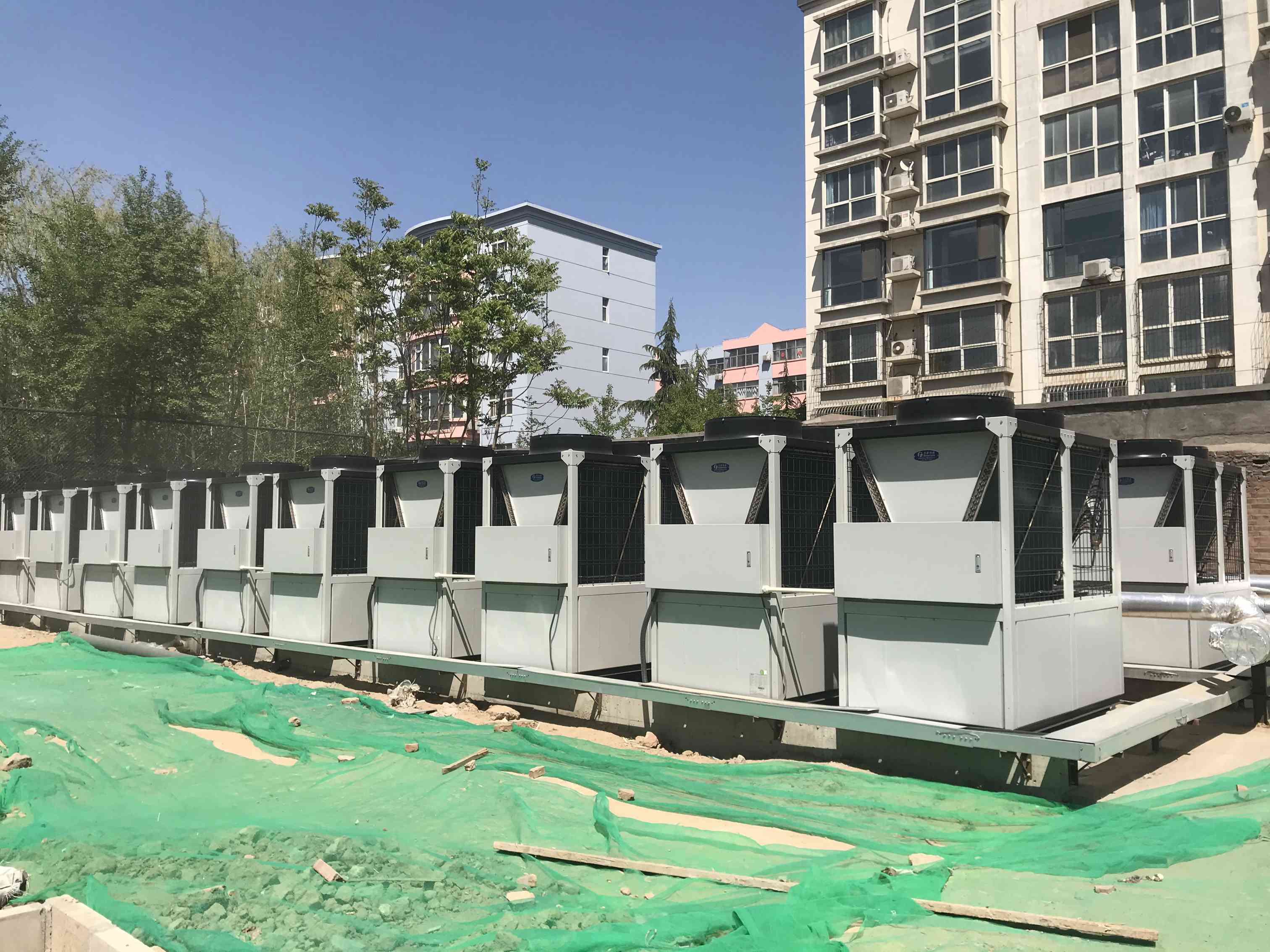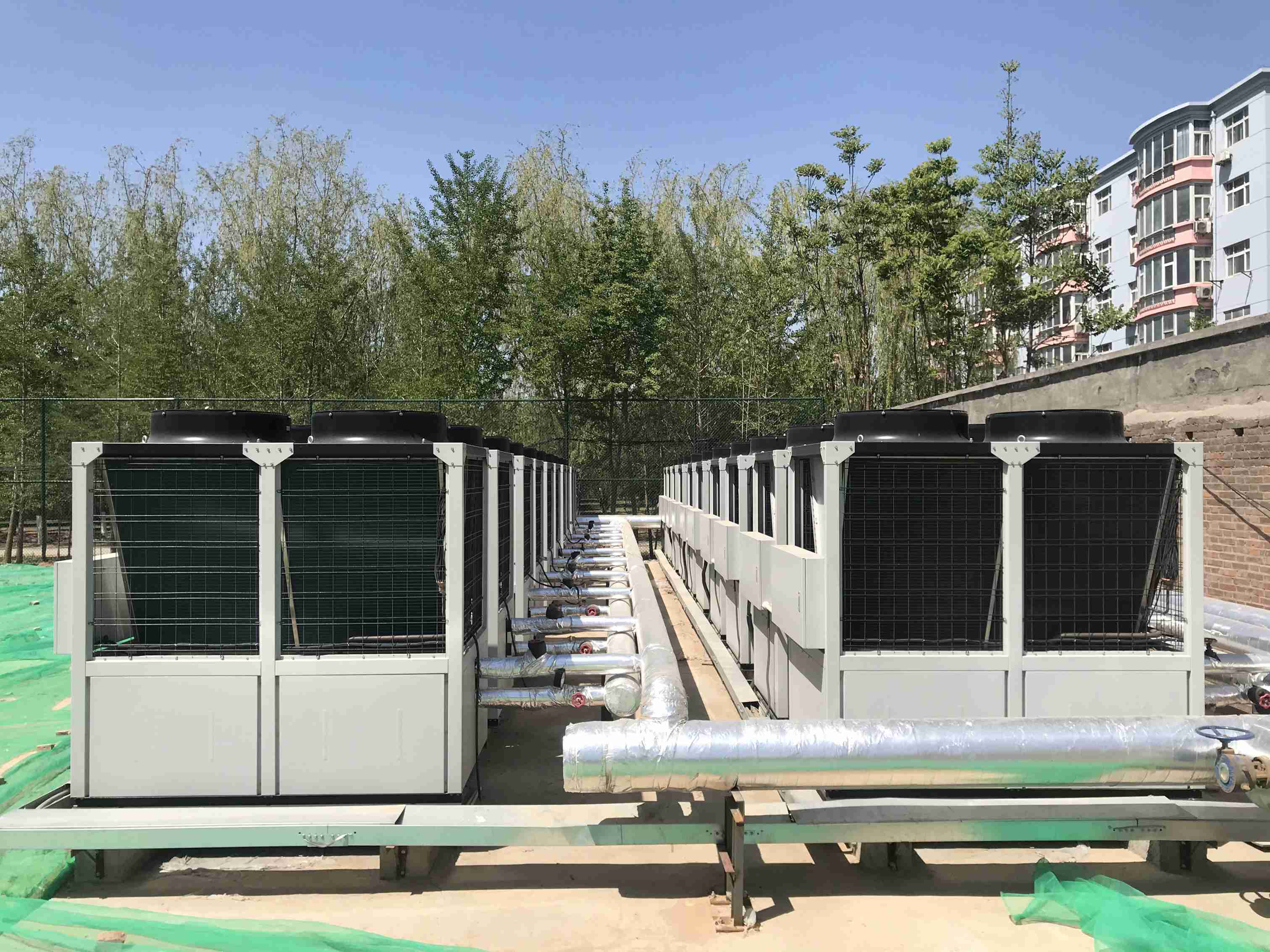 該賓館采暖制冷面積共計(jì)13860平米,冬季采暖室內(nèi)溫度18-22℃、夏季制冷室內(nèi)溫度24-28℃,末端采用風(fēng)機(jī)盤管。原先采用天然氣鍋爐提供熱源,后來因運(yùn)行費(fèi)用過高,賓館決定進(jìn)行新能源綜合利用的項(xiàng)目改造,選用天舒空氣源熱泵風(fēng)冷機(jī)組50匹共10臺(tái),完美解決冬季采暖、夏季制冷的需求。