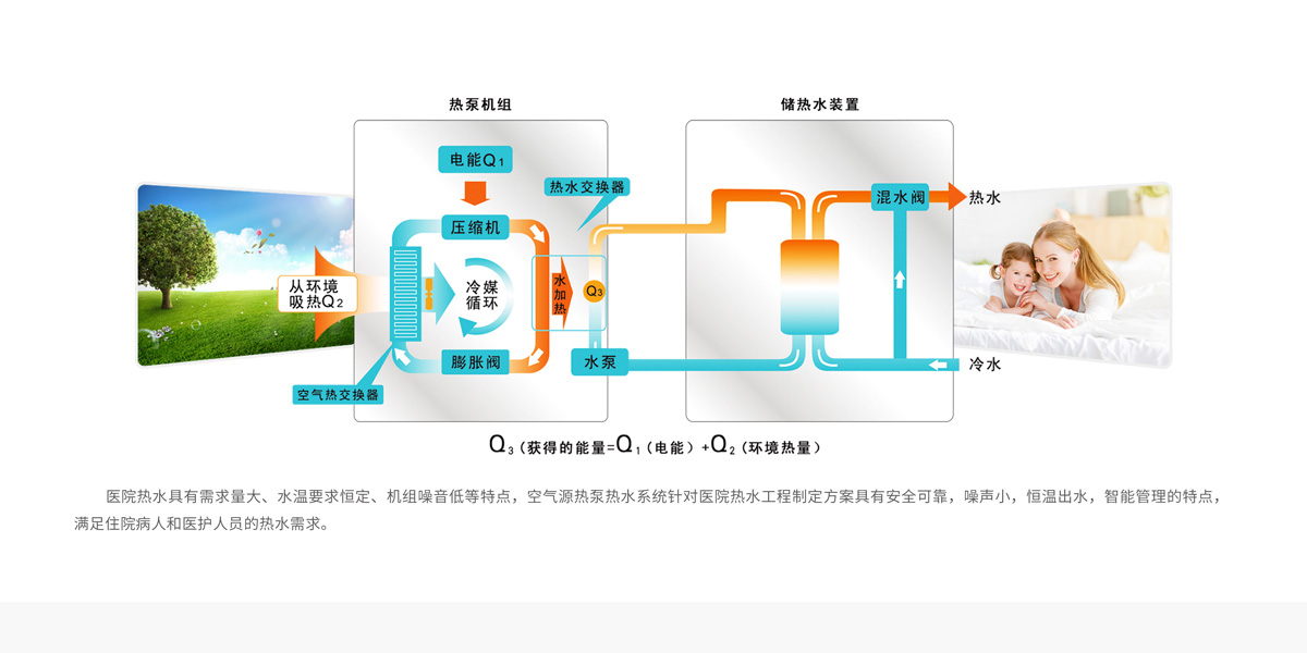 醫(yī)院熱水需要水溫恒定,機(jī)組噪音小等要求。