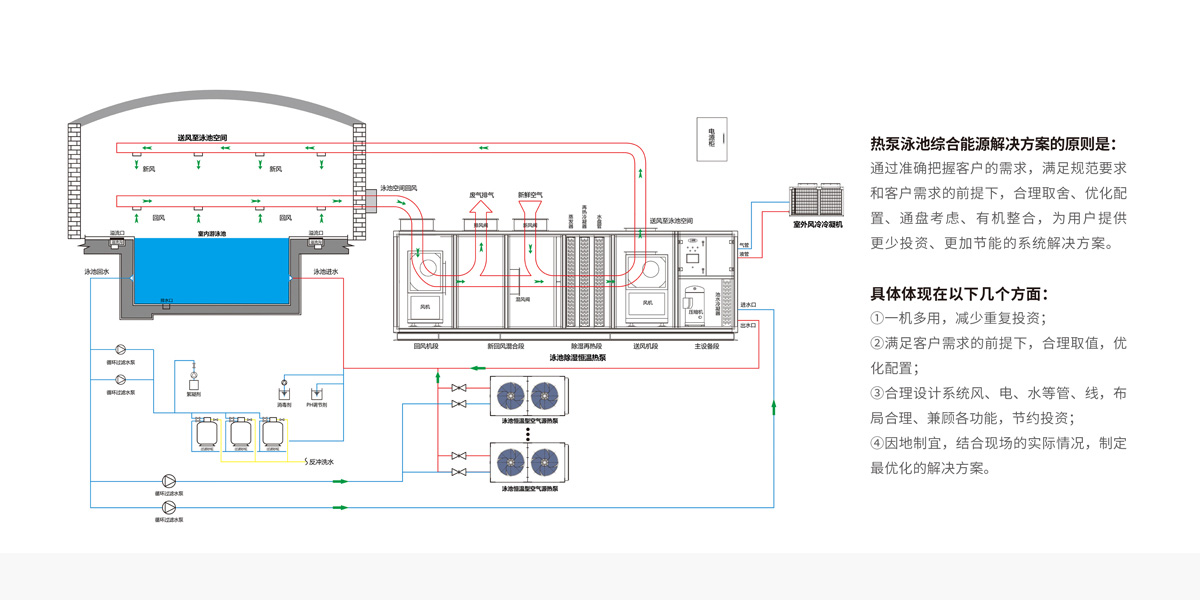 根據(jù)學(xué)校泳池具體情況,如尺寸大小、建筑結(jié)構(gòu)、使用時(shí)間、熱水需求、空調(diào)需求等等,優(yōu)化方案,打造高能效系統(tǒng),減少能耗。