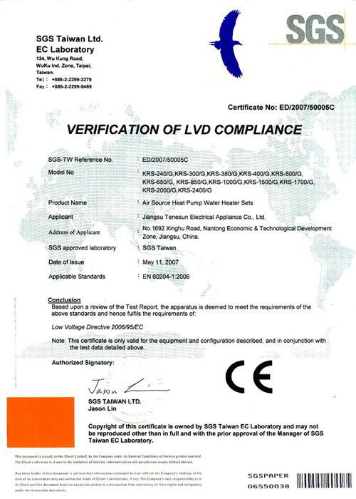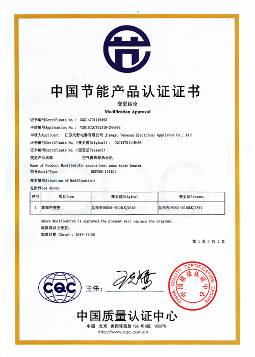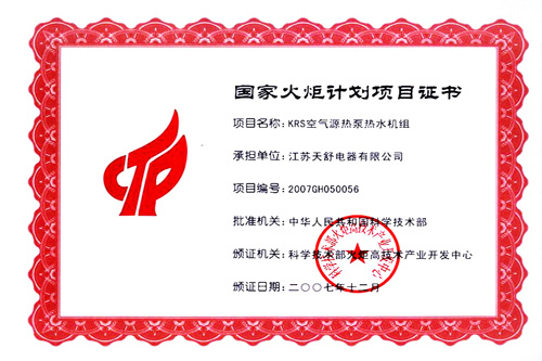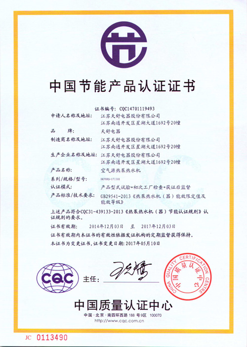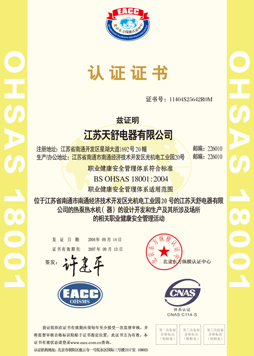 2004年10月,天舒空氣源熱泵熱水器通過國家3c強(qiáng)制認(rèn)證,使得產(chǎn)品安全性得到全面驗(yàn)證。
