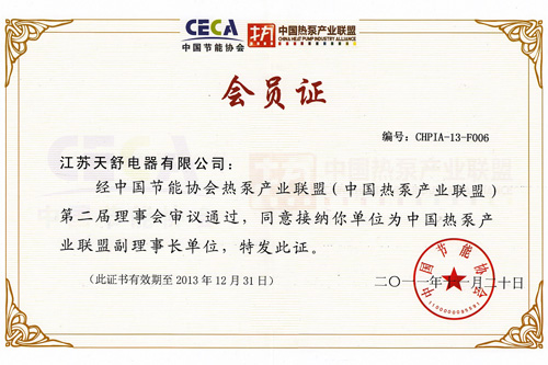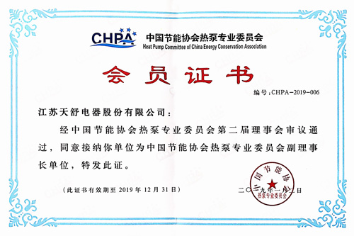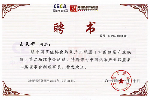 2014年08月,成為中國節(jié)能協(xié)會(huì)熱泵專業(yè)委員會(huì)副理事長單位,總經(jīng)理王天舒出任中國節(jié)能協(xié)會(huì)熱泵專業(yè)委員會(huì)第一屆理事會(huì)副理事長。