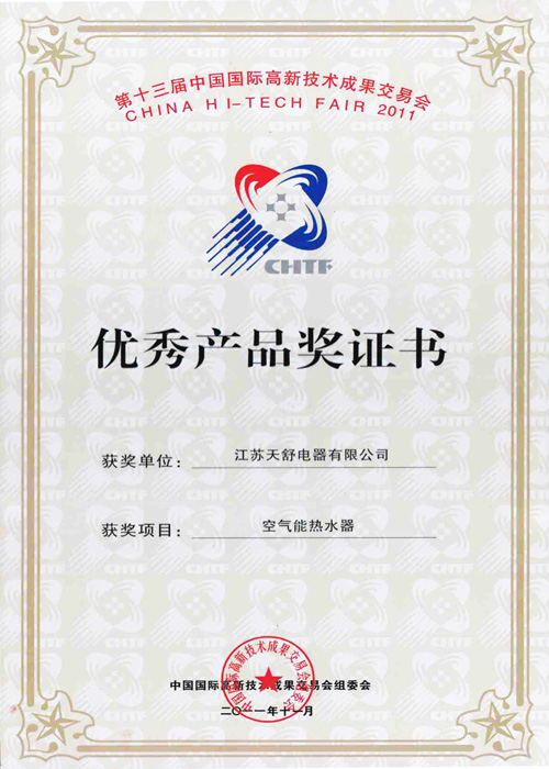 2011年11月,天舒空氣能熱水器在第十三屆中國國際高新技術(shù)成果交易會(huì)獲優(yōu)秀產(chǎn)品獎(jiǎng)。