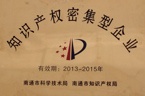 2013年4月,榮獲江蘇省企業(yè)知識(shí)產(chǎn)權(quán)戰(zhàn)略先進(jìn)單位,知識(shí)產(chǎn)權(quán)密集型企業(yè)。