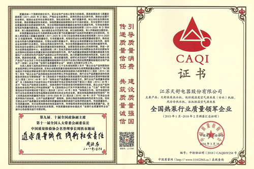 2015年07月,天舒公司獲得中國環(huán)境標(biāo)準(zhǔn)產(chǎn)品認(rèn)證,成為熱泵行業(yè)第一家通過認(rèn)證的企業(yè)。