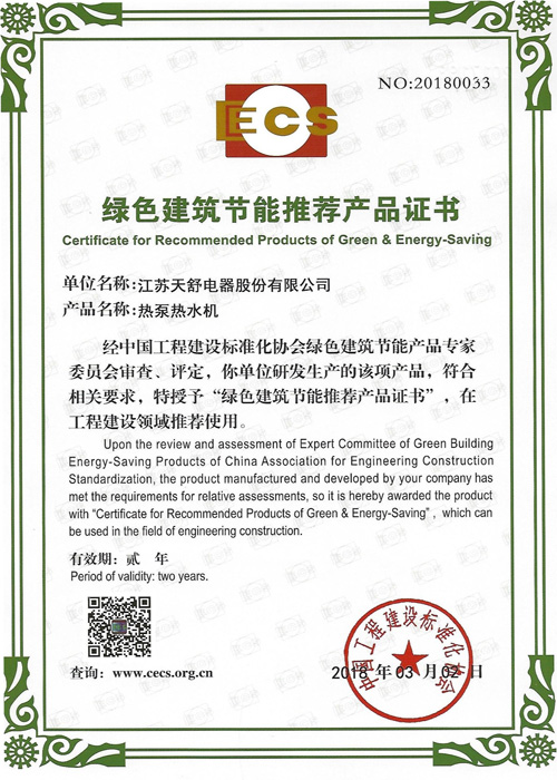2020年04月,天舒熱能產(chǎn)品獲"綠色建筑節(jié)能推薦產(chǎn)品"認(rèn)證證書。