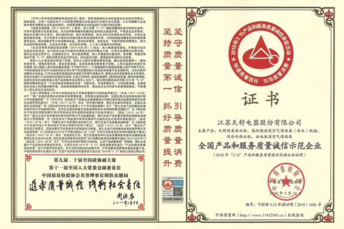 2019年 03月,天舒熱能獲"全國產(chǎn)品和服務(wù)質(zhì)量誠信示范企業(yè)"榮譽(yù)稱號(hào)。