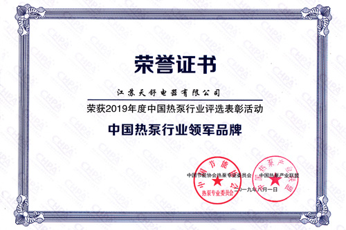 2019年07月,天舒熱能再次斬獲"行業(yè)領(lǐng)軍品牌"的榮譽(yù)稱號(hào)。