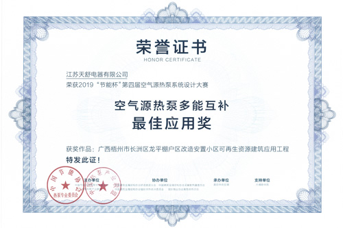 2019年07月,榮獲2019"節(jié)能杯"第四屆空氣源熱泵系統(tǒng)設(shè)計(jì)大賽"空氣源熱泵多能互補(bǔ)最佳應(yīng)用獎(jiǎng)"。