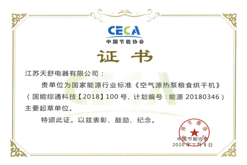 2020年01月,天舒主筆起草國家能源行業(yè)標(biāo)準(zhǔn)《空氣源熱泵糧食烘干機(jī)》。