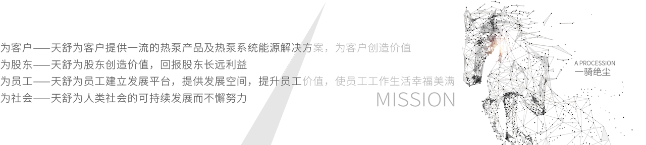 天舒不忘初心,牢記使命,致力于環(huán)保節(jié)能事業(yè)發(fā)展。一直以來,天舒引領(lǐng)國內(nèi)熱泵行業(yè)發(fā)展,開啟環(huán)保事業(yè)新篇章。早在各地政府的煤改電扶持政策下發(fā)前,天舒已在全國范圍內(nèi)大力實(shí)施農(nóng)村煤改電項(xiàng)目。天舒積極響應(yīng)國家全民健身計(jì)劃,打造綠色健身泳池系統(tǒng)方案。天舒不斷探索熱泵應(yīng)用新領(lǐng)域,例如烘干、冷熱回收等,開發(fā)的一系列新產(chǎn)品在農(nóng)業(yè)、種植業(yè)、畜牧業(yè)等傳統(tǒng)行業(yè)得到廣泛使用,掀起環(huán)保節(jié)能新浪潮,帶動(dòng)能源改革,引領(lǐng)行業(yè)從千億級(jí)市場(chǎng)向萬億級(jí)市場(chǎng)跨越。創(chuàng)立至今,天舒的腳步不曾停歇,每一步都在為更綠色的世界積蓄能量。